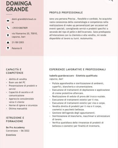 cerco lavoro come estetista . possibilmente se lontano dalla mia posizione abitativa , vorrei ovviamente se possibile alloggio